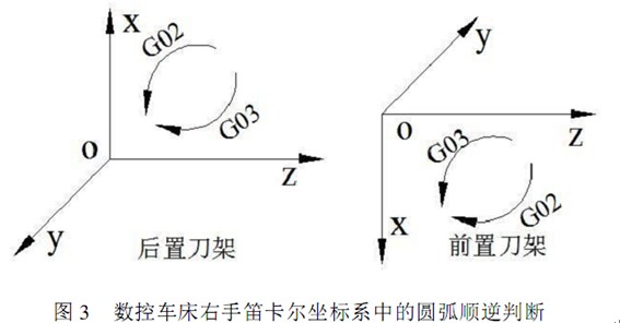 實踐證明,在實際生產(chǎn)過程中,可以不考慮右手笛卡爾坐標(biāo)系,直接看零件圖就判斷出圓弧加工的左右補償,即在圓弧編程時,始終只分析零件圖軸線上半部分圓弧形狀,當(dāng)沿該段圓弧形狀從起點畫向終點為順時針方向時就用GO2 ,反之就用 GO3。原因很簡單,車床指向刀架的為X 軸的正方向,指向尾座為Z 的正方向,那么前后刀架的X 軸的方向是相反的,就導(dǎo)致參與判斷的第三軸 Y 軸的正方向是相反的,一個指向紙外,一個指向紙內(nèi),如圖3 所示。在后置刀架的數(shù)控車床加工中,由于 Y 軸指向紙外,在 XOZ 坐標(biāo)系中我們直接選擇工件的零件圖軸線上半部分圓弧形狀判斷圓弧順逆,而前置刀架的數(shù)控車床Y 軸指向紙內(nèi),我們選擇工件的零件圖軸線下半部分圓弧形狀判斷圓弧順逆時應(yīng)該從紙內(nèi)向紙外觀察,其結(jié)果正好與