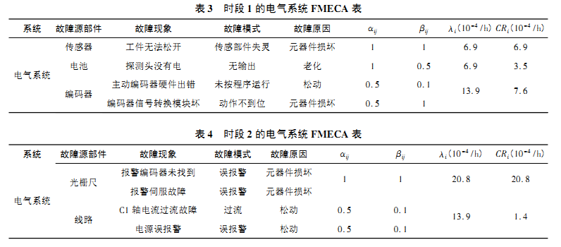通過FMECA分析表能夠直觀地分析出哪種故障對(duì) 生產(chǎn)的危害度最大。由表3得出,時(shí)段1時(shí)的編碼器危害 度大于其他2項(xiàng),是加工中心在時(shí)段1時(shí)最應(yīng)該加以防護(hù) 的危害。在時(shí)段2時(shí),光柵尺危害度達(dá)到了 20. 8,是整個(gè) 系統(tǒng)中危害度最大的一項(xiàng),而且都是因?yàn)楣鈻懦邠p壞造成 的,在日常維修工作中還需改善光柵尺選型及定期清理等 相關(guān)工作。從時(shí)段1和時(shí)段2的FMECA分析表中得出,2 個(gè)故障器的電氣系統(tǒng)常見故障危害度并不相同,這是因?yàn)?加工中心在不同的時(shí)間段里會(huì)表現(xiàn)出不同的故障,所以, 對(duì)加工中心不同故障時(shí)期的研究是有著重要的現(xiàn)實(shí)意義 及實(shí)用價(jià)值的。
