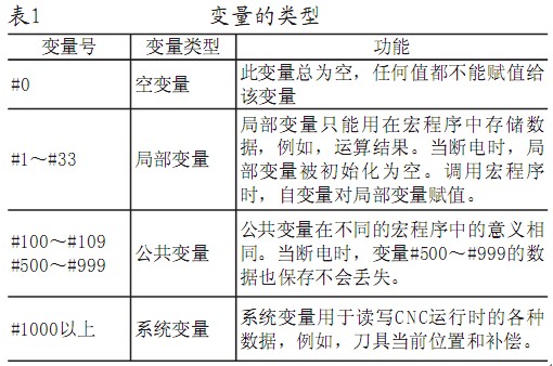 一般的編程中允許對變量命名,用戶宏程序不可以,一個變量需用“#”號和后面的變量號指定。變量號可以是數(shù)值或表達(dá)式,但必須注意此時表達(dá)式必須封閉在“[]”中。例如:#1(主要用于A類宏指令);#[#1+#3+5]若#1=100,#3=2,則該變量表示#107。