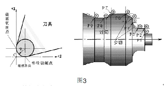 數控車床是按車刀刀尖對刀的,在實際加工中,產生磨損及精加工時車刀刀尖磨成半徑不大的圓弧刀的刀尖不可能絕對尖,總有一個小圓弧,所以對刀尖的位置是一個假想刀尖『,如圖所示,編程時是按假想刀尖軌跡編程,即工件輪廓與假想刀尖『重合,車削時實際起作用的切削刃卻是圓弧各切點.這樣就引起加工表面形狀誤差、