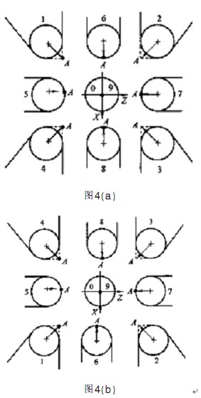 根據車刀的形狀確定位置參數,數控車削使用的刀具有很多種,不同類型的車刀其刀尖圓弧所處的位置不同,如圖所示〔)將車刀的形狀和位置用刀尖方位參數T來表示,A點為假象的刀尖點,刀尖方位參數共有8個(n -g) >當使用刀尖圓弧中心編程時,可以選用。或9})圖(a)為刀架前置的數控車床假象刀尖的位置;圖((b)為刀架后置的數控車床假象刀尖的位置、