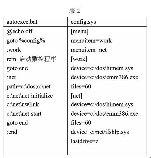 客戶端計算機如果是帶有 Windows 操作系統的計算機,那么網卡的安裝與網絡參數設置同上,不用設置共享文件夾工作組名稱一定要相同,IP 地址應該在同一網段,這樣客戶端用戶就可以通過訪問服務器端計算機上的共享文件夾直接獲取所需數控文件 如果客戶端計算機是 DOS 操作系統,那么就需要安裝 MS Client 軟件來配置計算機 MS Client 軟件的安裝盤有兩張軟盤,一般只用到第一張 將所用網卡的 NDIS網卡驅動程序 *.DOS 復制到此軟盤內,MS Client 軟件安裝網卡時要用到 運行安裝程序,按照安裝程序的提示依次輸入所需信息 注意工作組和用戶的名字一定要與服務器端設置的名字一致,通信協議 (protocol ) NetBEUI 必選,如果是 ISA總線的網卡,還需要設置中斷號和 I/O 地址 安裝完成后系統會在根目錄下生成新的 AUTOEXEC.BAT 和 CONFIG.SYS 文件,為了工控機正常運行需要將其配置為多任務啟動方式在需要傳輸文件時系統進入聯網模式,不需要是關閉網絡連接,釋放系統資源提高系統運行速度 假設 MS Client 軟件安裝在 c:\net 文件夾內,那么文件內容如表2所示