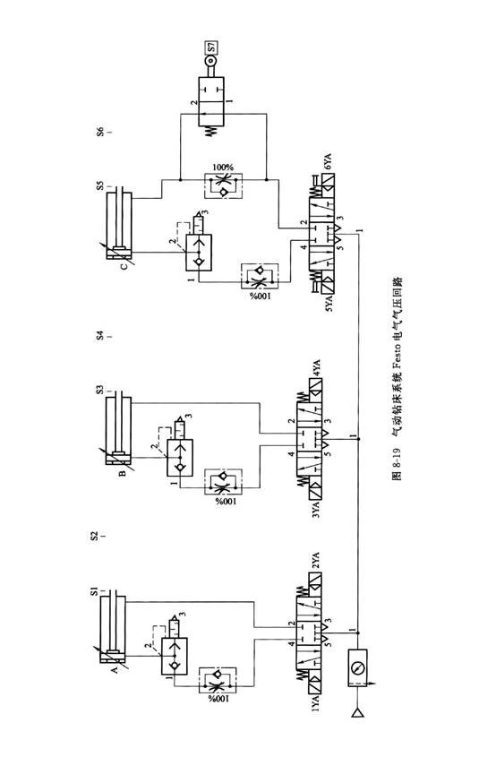 氣動(dòng)鉆床氣壓回路如圖8-19所示,案例中的氣動(dòng)鉆床氣壓傳動(dòng)系統(tǒng),是利用氣壓傳動(dòng)來實(shí)現(xiàn)進(jìn)給運(yùn)動(dòng)和送料、夾緊等輔助動(dòng)作。它共有三個(gè)氣缸,即由左至右分別是送料缸、夾緊缸、鉆削缸。