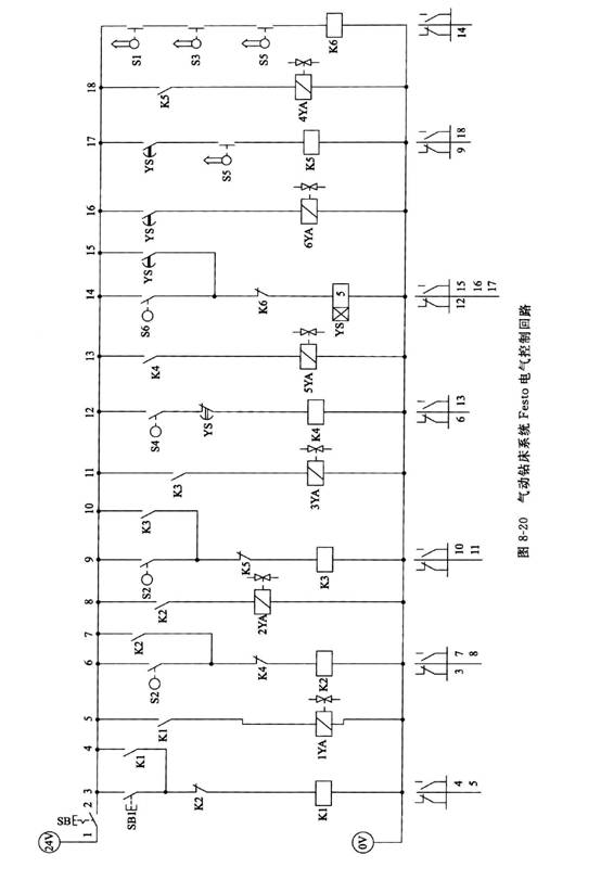 整個(gè)氣動(dòng)系統(tǒng)就是對(duì)三個(gè)缸的控制,由于氣缸往復(fù)頻率較高,因而選擇緩沖氣缸,同時(shí)利用行程開關(guān)控制氣缸到達(dá)行程終點(diǎn)時(shí)的預(yù)定換向動(dòng)作。主控閥采用三位五通雙電控先導(dǎo)式電磁閥,氣缸速度通過單向節(jié)流閥來調(diào)節(jié);為使氣缸快速排氣,加快氣缸運(yùn)動(dòng)速度,設(shè)置了快速排氣閥;回路中設(shè)置的二位二通行程閥是為了實(shí)現(xiàn)鉆削缸快進(jìn)和工進(jìn)的換接,且可使換接平穩(wěn)。氣動(dòng)鉆床電氣控制回路如圖8-20所示。