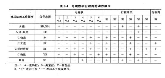 (3)氣動(dòng)鉆床系統(tǒng)電磁鐵和行程閥的動(dòng)作順序見表8_4 0