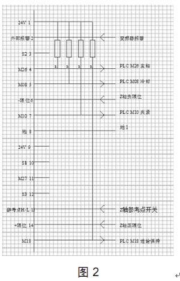 (2)與 PLC不能直接連接,需要通過上拉電阻的方式實(shí)現(xiàn)改造后的系統(tǒng)使用的是歐姆龍的 PLC,沒有內(nèi)置 24 V電源,且需要的輸入信號是較小的電壓信號 而大地?cái)?shù)控系統(tǒng)輸出的信號是開關(guān)信號,接入 24 V電源后,通過上拉電阻的方式才能實(shí)現(xiàn)與其通訊,見圖2